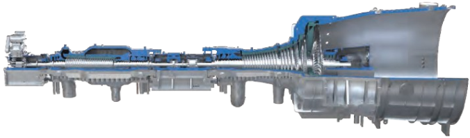 TX-2 series turbines are available in both down- and axial-exhaust configurations, wherein the axial-exhaust design allows for centerline height reduction, allowing for a reduced construction area and more economical plant construction costs.