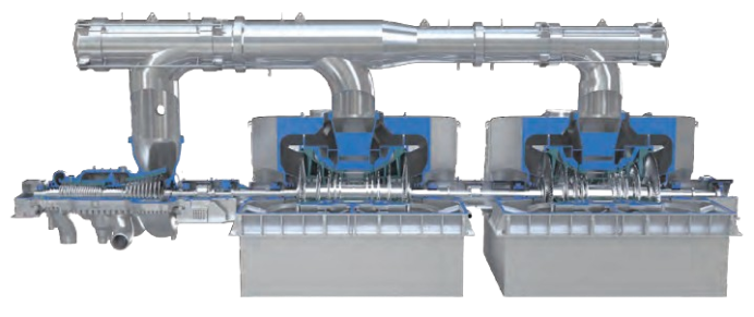 The TX-6 steam turbine power train consists of one reverse flow high-pressure / intermediate-pressure (HIP) turbine and two double flow low-pressure turbines, featuring 3 casings. The TX-6 gives customers the option to choose between down- and side-exhaust, providing additional degree of overall plant design flexibility.