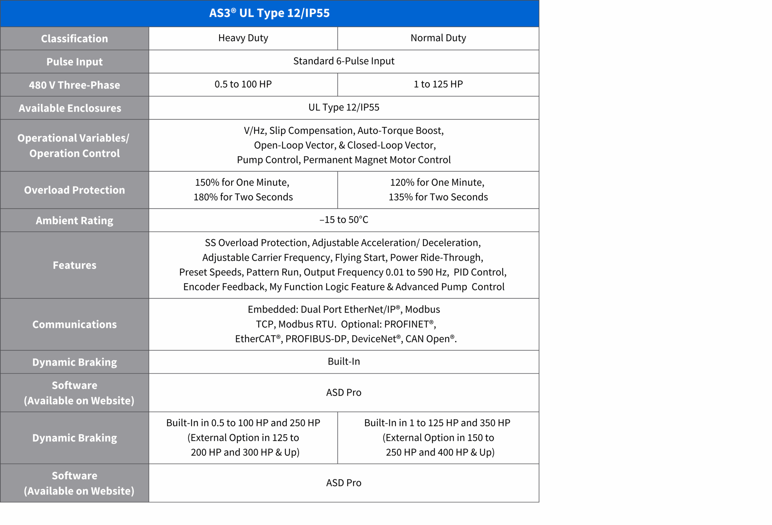 The Toshiba AS3 series adjustable speed drive is constructed for demanding industrial applications, offering robust, energy-efficient performance with minimal maintenance. Built to withstand harsh environments, the totally enclosed UL Type 12/IP55 AS3 is dustproof, optimal for environments with small particles floating around. It seamlessly integrates into modern operations with dual PID control, multiple motor control modes, and built-in communication protocols. The AS3 series supports various motor control applications and features an IP65-rated LCD keypad for easy operation.