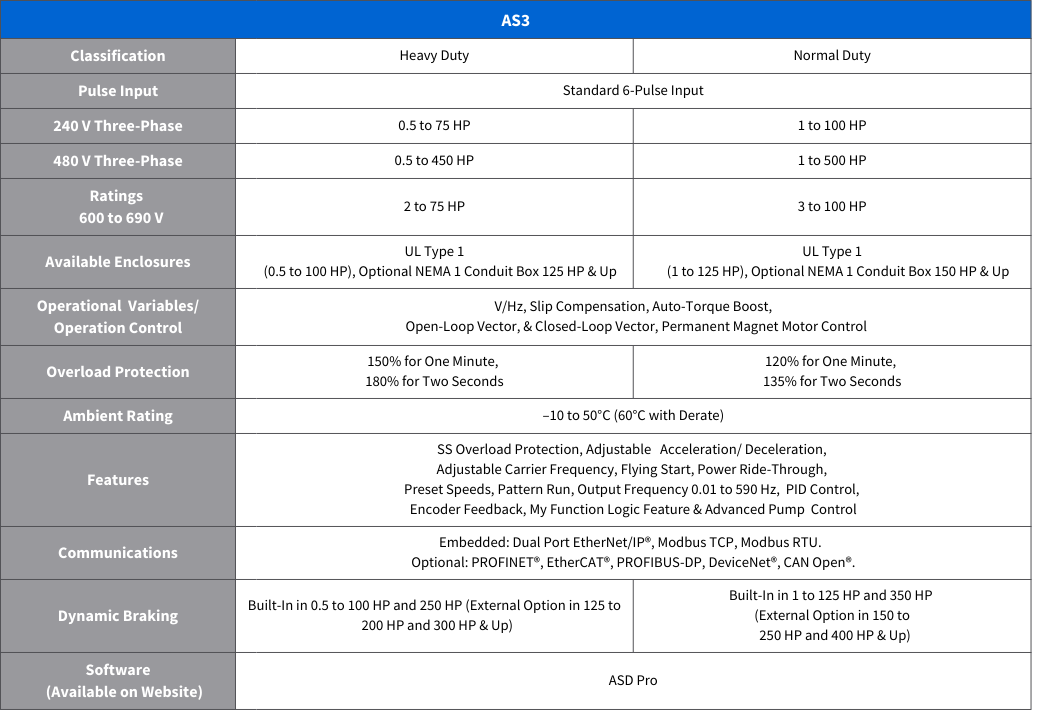 The Toshiba AS3 series adjustable speed drive is designed for demanding industrial applications, offering a robust, energy-efficient solution that enhances performance and safety while minimizing maintenance and downtime. Featuring dual PID control, multiple control modes, and built-in communication protocols like Modbus TCP and Ethernet/IP, the AS3 series integrates seamlessly into modern digitalized operations. It supports a wide range of motor control applications, including pumps, fans, and compressors, with high overload capacity and comprehensive protection features. With an intuitive interface, Industry 4.0/IoT readiness, and US-based customer support, the AS3 series is a reliable and flexible choice for maximizing system efficiency and reducing the total cost of ownership.