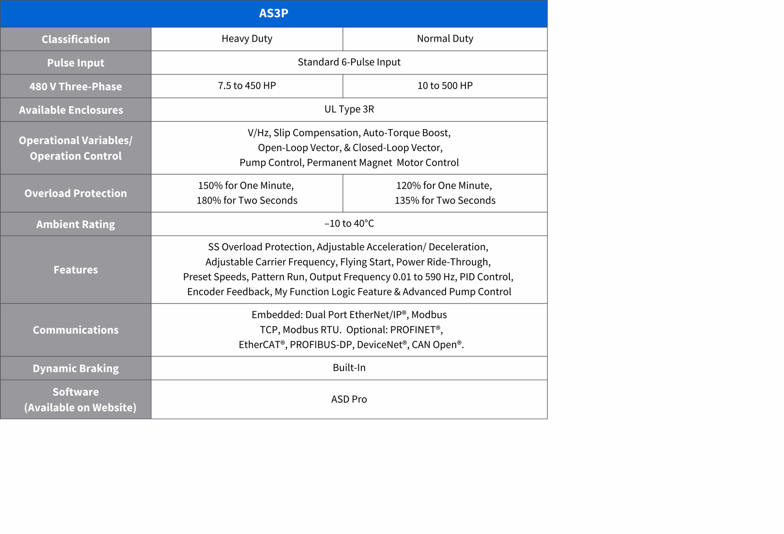 Toshiba’s AS3P series offers a UL Type 3R free-standing enclosure to protect electrical components from environmental conditions. This durable and cost-effective solution, with a short lead time, makes it suitable for demanding industrial environments. Customizations include adding door-mounted pilot devices, surge arrestor protection, space heaters to prevent moisture accumulation, and line reactors to minimize harmonics. With a combination of robust protection and advanced functionality, the AS3P series is an excellent choice for reliable and efficient performance in outdoor applications.