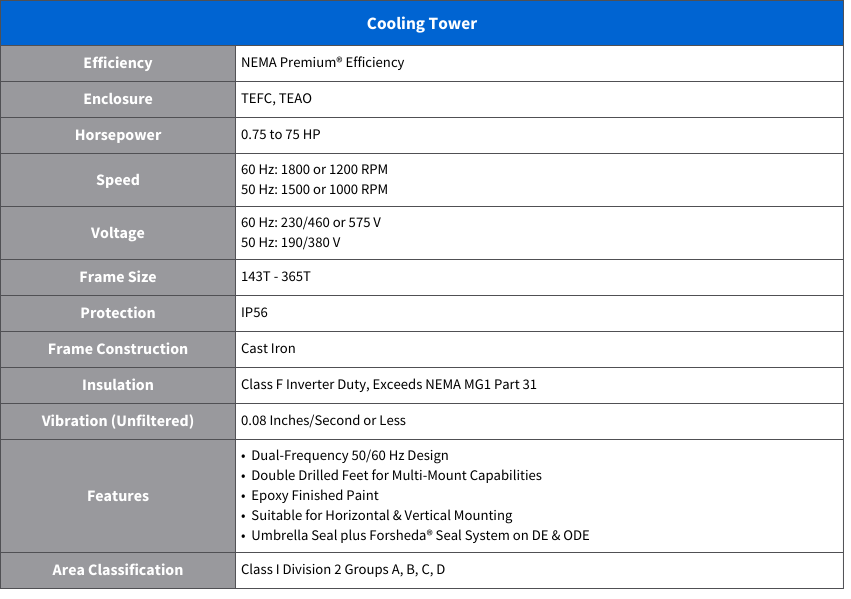 Toshiba’s EQP Global® Cooling Tower motor series is specifically designed for the demanding environments of cooling tower applications, where heat and humidity prevail. With a robust design and premium construction, this series offers two enclosure options: totally enclosed fan cooled (TEFC) and totally enclosed air over (TEAO). The EQP Global® Cooling Tower series is equipped with a double seal arrangement, providing an IP56 rating, effectively shielding against moisture and contaminants, and providing reliable operation even in demanding conditions. Coated with a corrosion-resistant severe duty epoxy paint system, the motor can withstand severe operating conditions, including 100% humidity.