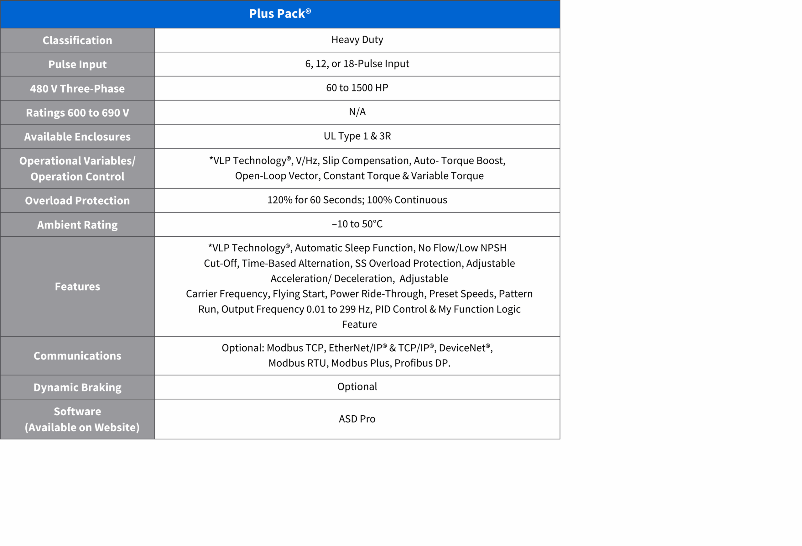 Toshiba’s Plus Pack is a high-performance, large-horsepower adjustable speed drive (ASD) designed for energy efficiency in demanding applications. The NEMA 3R version is built for outdoor use, with a durable white paint finish that enhances resilience in harsh environments. Equipped with two Half/Full Duplex RS485 communication ports, it allows flexible and efficient data transmission, providing seamless integration with multiple devices and reliable communication in complex industrial networks. The Plus Pack delivers reliable, continuous operation, making it ideal for powering large industrial equipment, including pumps, compressors, and heavy-duty conveyor belts.