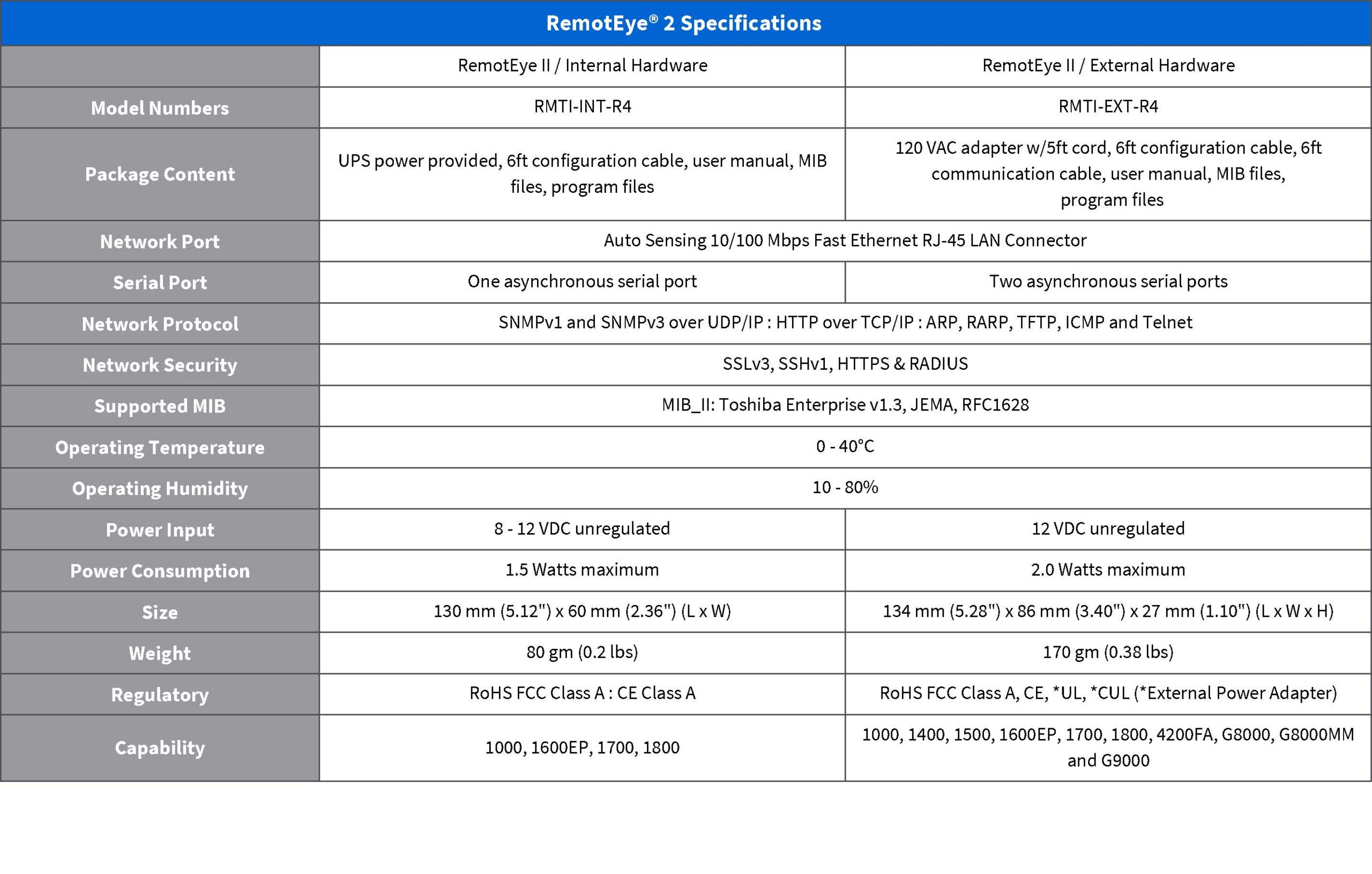 RemotEye ® II is a complete Toshiba Uninterruptible Power Systems (UPS) management solution. RemotEye® II is a tool designed to control and monitor Toshiba UPS remotely via Simple Network Management Protocol (SNMP) and Hypertext Transfer Protocol (HTTP/web browser) methods. In addition, when a power outage occurs, notifications can be sent to the network administrators or maintenance personnel. Should a prolonged power outage occur, RemotEye® II can initiate an orderly shutdown to connected servers to minimize any risk of data loss..