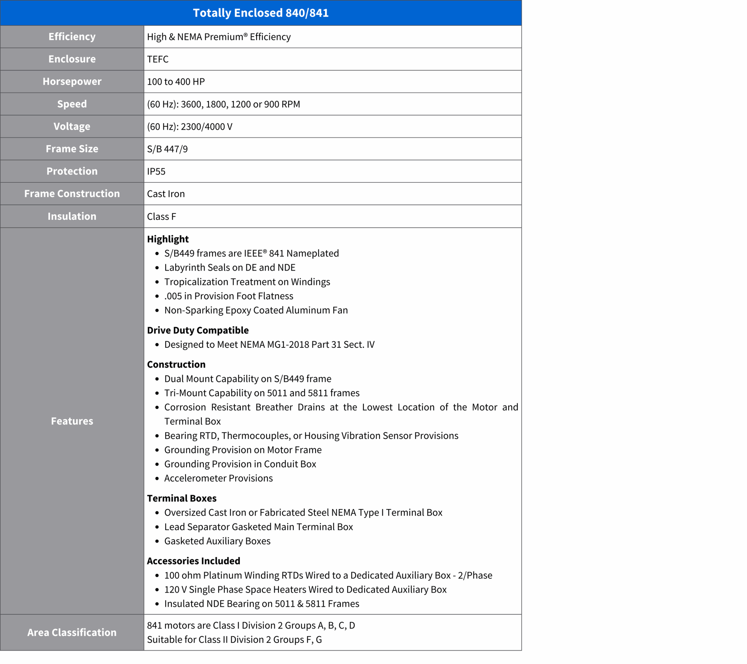For frames that fall outside 841 guidelines yet still require essential Petrochem Severe Duty features, Toshiba’s Totally Enclosed Fan Cooled (TEFC) 840 motor series is the ideal solution. Combining advanced mechanical enhancements with an IP55 rating, these motors deliver outstanding protection against moisture and contaminants. Engineered with heavy-duty construction, the 840 series excels in challenging environments, providing robust, versatile performance tailored to rigorous industrial demands.