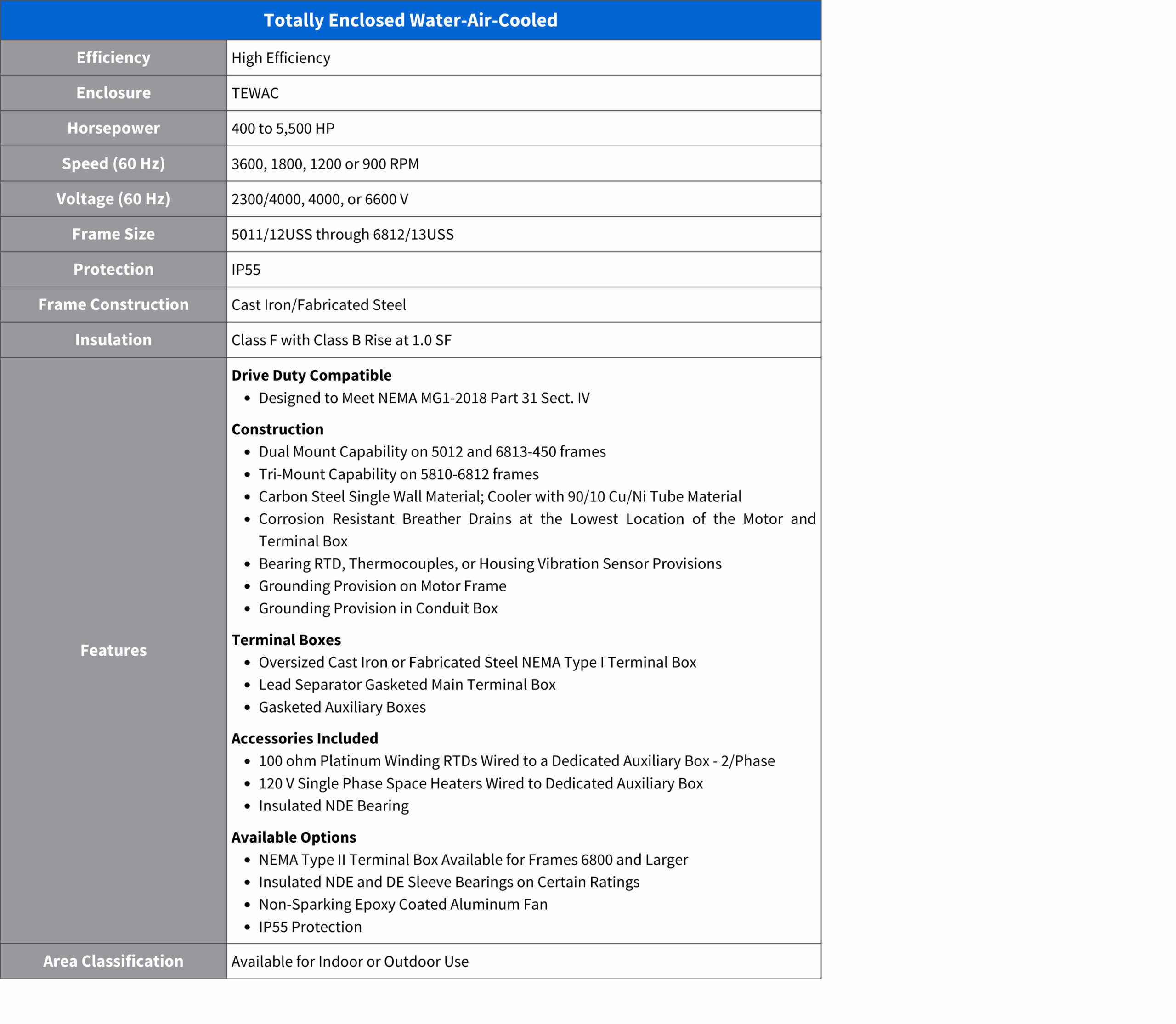 Toshiba’s Totally Enclosed Water-to-Air Cooled (TEWAC) motors are designed to meet the industry’s increasing demands for energy conservation and exceptional product performance. The efficient water-to-air or glycol-to-air cooling system enhances heat dissipation, allowing for higher output within a compact frame size. The fully enclosed design safeguards against contaminants such as dust, moisture, and corrosive elements. Whether for oil and gas exploration, chemical processing plant, or other industrial applications, TEWAC motors can be tailored to meet specific application requirements made possible by Toshiba’s in-house design, engineering, and manufacturing capabilities.