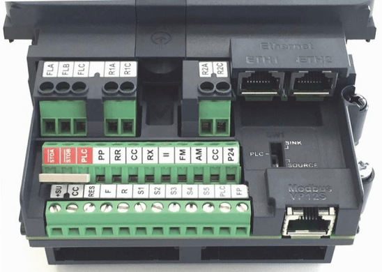 | Terminal Symbol | Input/Output | Function | Electrical Specifications | F | Input | Multifunction programmable digital input. In the default setting, forward run is performed with ON and deceleration stop with OFF. | Digital input. • 24 Vdc-5 mA or less Compliant with IEC61131-2 logic type 1 • Sink logic: ON < 10 V, 16 V < OFF • Source logic: OFF < 5 V, 11 V < ON Sink logic and source logic can be switched with the slide switch [SW1] |