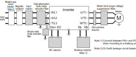 | [BU+] [BU-] | Inside the inverter. Connected to a braking unit (optional). Braking resistor (optional) is connected to a braking unit terminals [PA] and [PB]. | Frame size A8 |