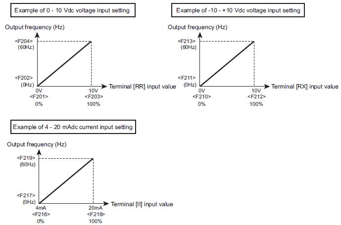 As default setting, the range between the minimum and maximum input amounts is set to 0 to 50.0/60.0 Hz for main analog signal of the terminals. For example, the terminal [RR] is set to 0 to 50.0/60.0 Hz at 0-10 V.