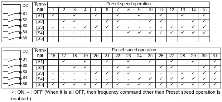 For example, high speed and low speed are switched with 1-speed and 2-speed. Up to 31-speed can be set. They can be used as interruption frequency commands because they have priority over other frequency commands.