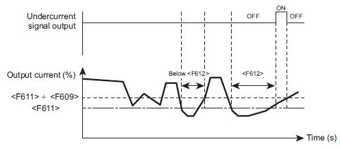 When a current level set in [F611 : Undercurrent detection level] or less is detected for the period of time set in [F612: Undercurrent detection time] or more, the invertor trips and “UC” is displayed. After tripping (UC) alarm signal remains ON.