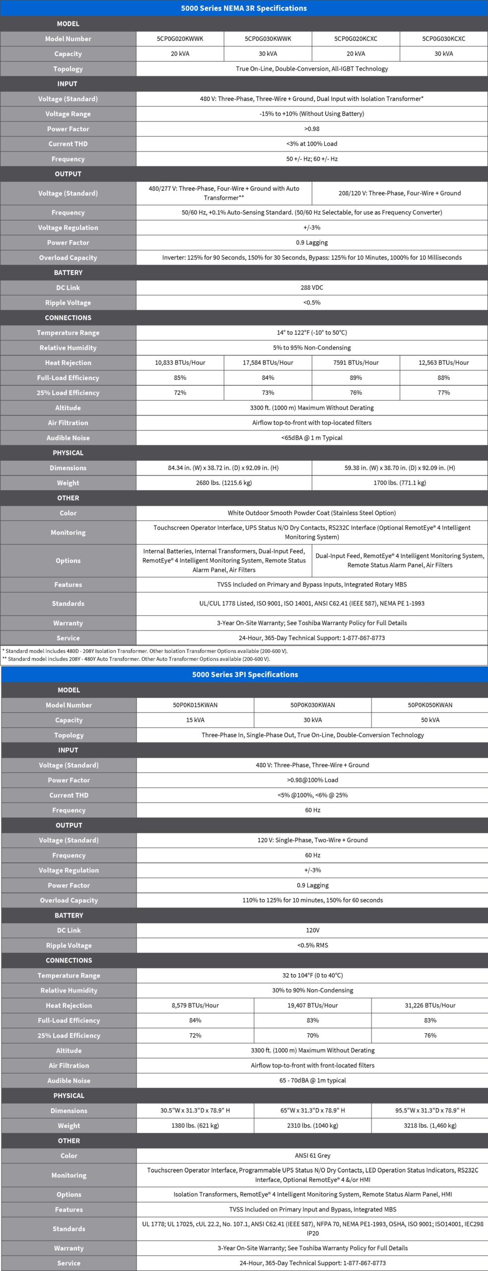 In 1967, Toshiba introduced the world’s first large-capacity uninterruptible power system (200 kVA). Continuing this legacy, Toshiba now offers the Industrial 5000 Series UPS, available in two configurations: the three-phase in, single-phase out 3P1 Solution and the NEMA 3R Solution for harsh environments. Both models feature industrial-grade components designed for a 20-year lifespan, with integrated surge protection.