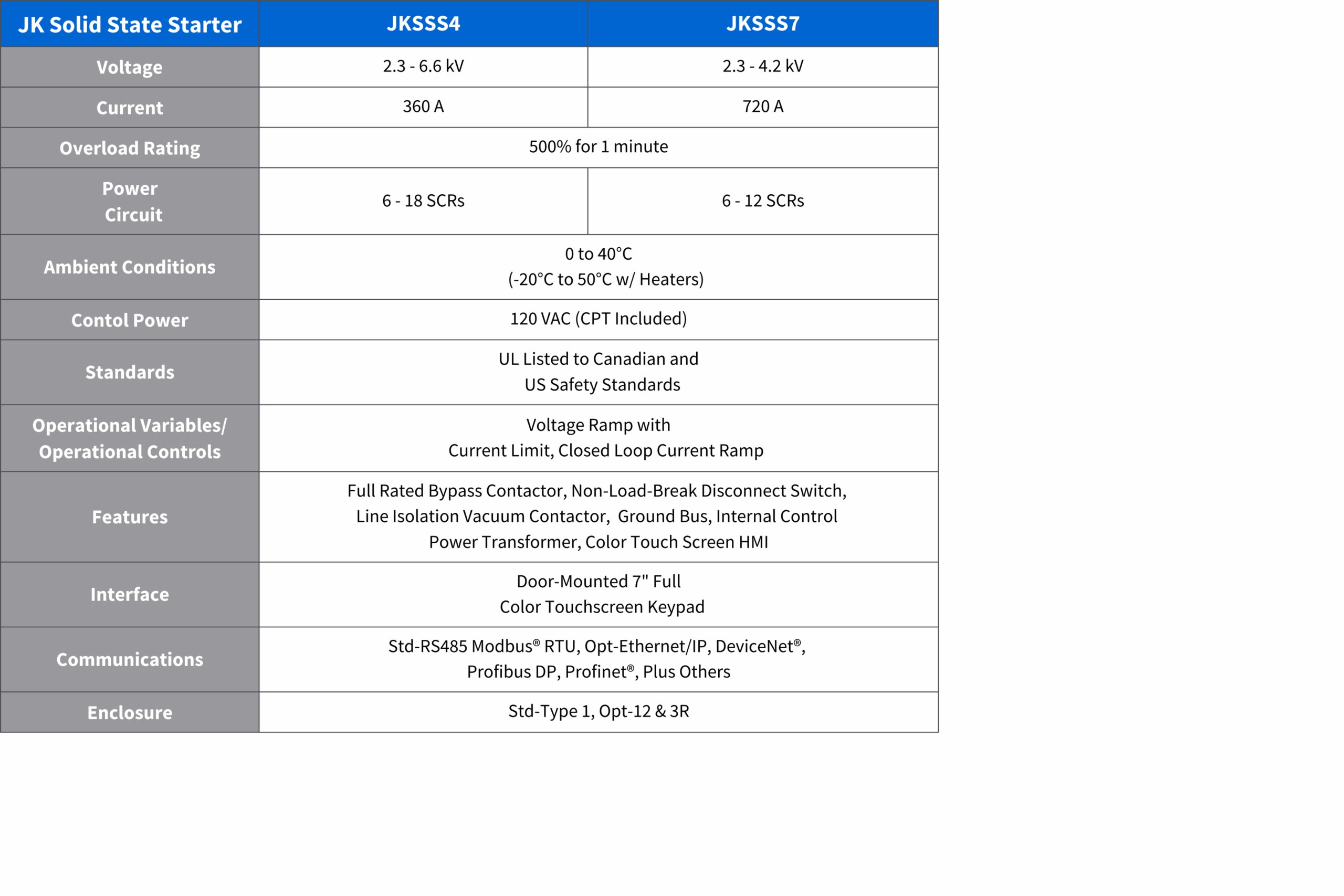 Toshiba’s medium voltage JK Solid State Starter series offers advanced control and protection for demanding industrial applications. Engineered with soft start and stop capabilities, it provides smooth acceleration and deceleration, reducing mechanical stress on equipment. With a high current capacity rated at 500% for up to 60 seconds and true thermal modeling, these starters are built to handle challenging conditions. Their adaptable design allows seamless integration as standalone starters or within control center lineups. Utilized with Toshiba’s HVK/VK switchgear, JK starters are ideal for controlling induction, wound rotor, or synchronous motors, as well as transformers, and capacitors.