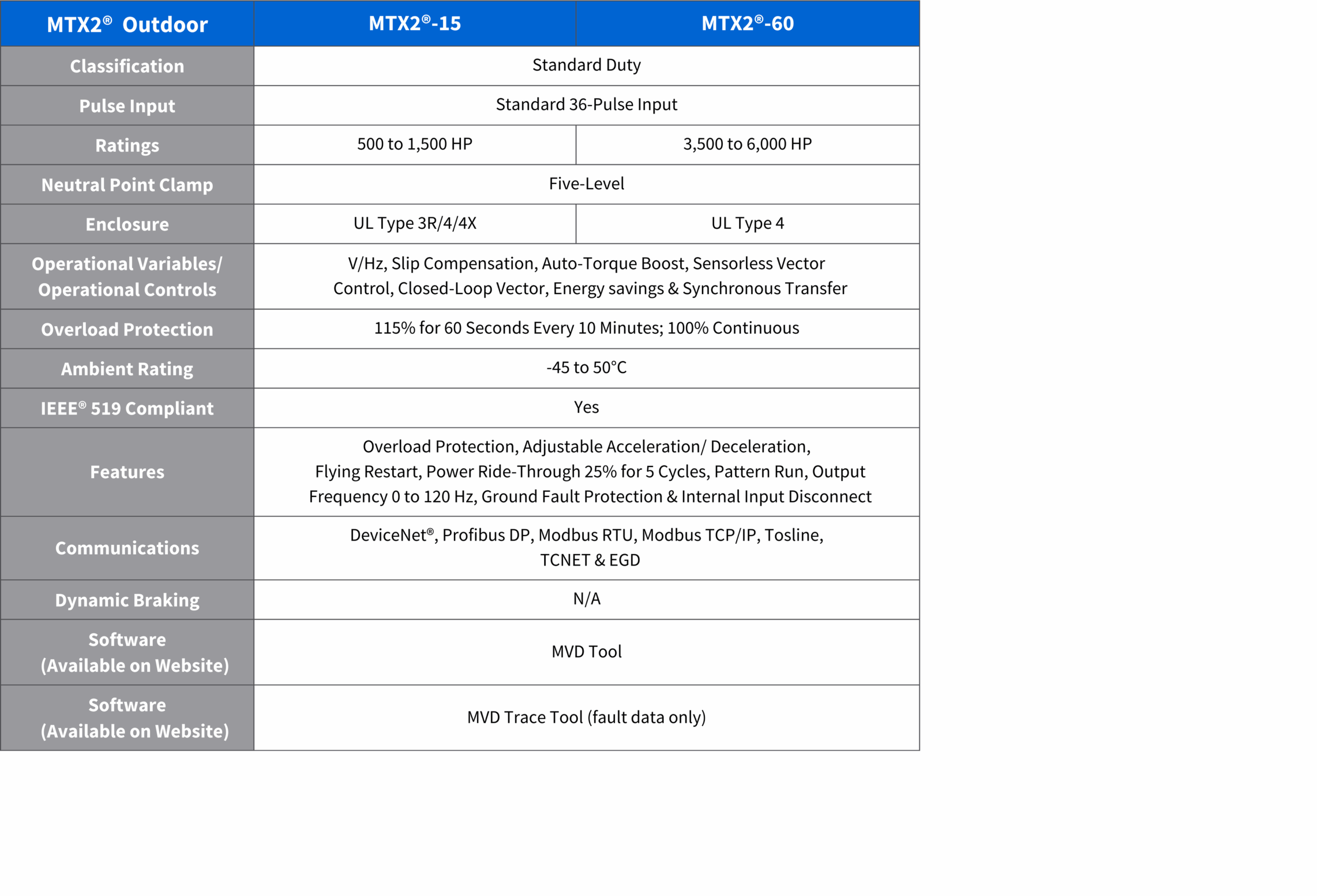 Toshiba’s MTX2 UL Type 3R outdoor medium voltage adjustable speed drive is one of Toshiba’s most innovative offerings, designed with a totally enclosed cooling system that eliminates the need for an air-conditioned E-house, reducing both footprint and construction costs. This robust drive features an advanced enclosure design and power section topology with removable power modules, improving Mean Time to Repair (MTTR) and providing reliable performance in harsh environments. Specifically engineered for outdoor mounting in remote locations, the MTX2 series is available in UL Type 3R/4/4X ratings and is built to withstand extreme environmental conditions.
